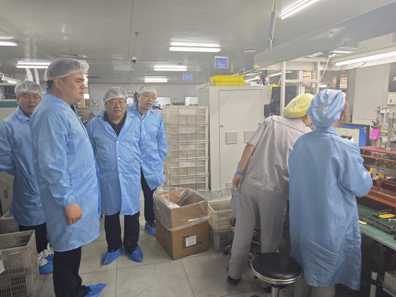 在江苏云意电气股份有限公司,王传喜校长与云意电气人事部的杜经理进行深入交流,详细了解学生的实习安全情况、企业满意度以及用人需求情况,随后到学生实习工作岗位看望了学生。
