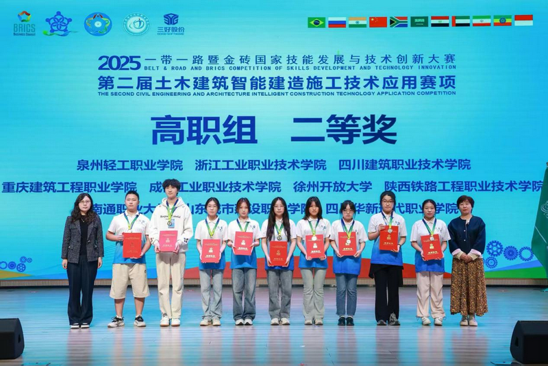10月17日至19日,2025“一带一路”暨金砖国家技能发展与技术创新大赛第二届土木建筑智能建造施工技术应用赛项决赛在重庆成功举办。我校2022 级工程造价2班曹雨婷、乔子涵同学荣获高职组二等奖(银牌),王琦、薛冲老师荣获“优秀指导老师”荣誉称号,我校荣获“优秀组织奖”。